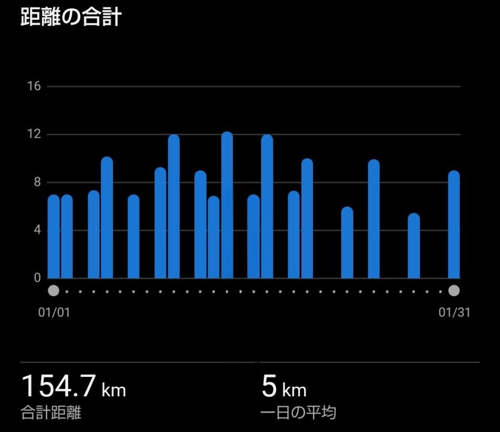 アルコール依存症対策で走ってるので、練習内容も上げていこうと思います。1月の練習ですが、入院後期から退院後の時期です。1月25日の10キロレースに出場するため、スピード練習を少し入れた感じです。一番のポイントは14日の1,000m×4インターバルですね。宝ヶ池1周1.5キロコースで走りました。体がスピードに対応してないのか練習後に寝込みました(笑)。月間距離は154.7キロ、入院から退院へ環境が変わり、大会も走った状況としては、まずまず走れたと思います。